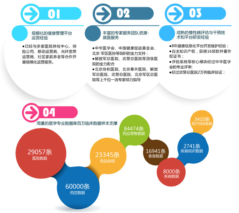 易康盛世服务站面向社区健康服务机构、企事业单位等提供定制化、综合性的健康管理服务,为各类健康管理服务机构提供“健康小屋+易康盛世平台+医疗资源”的多终端整体解决方案。同时为终端客户提供“健康信息采集+健康档案维护+健康风险评估+健康干预方案+远程医学服务”的全流程健康管理服务。